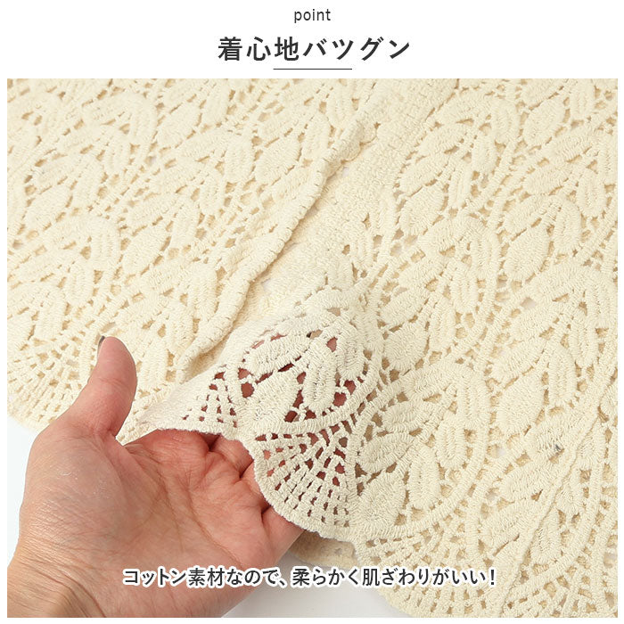 ・ざっくりとした編み目でブラウスやTシャツにサッと重ねるだけでおしゃれ度アップ。ワンピースでもデニムでも楽しめて、コーデの幅がぐっと広がる。