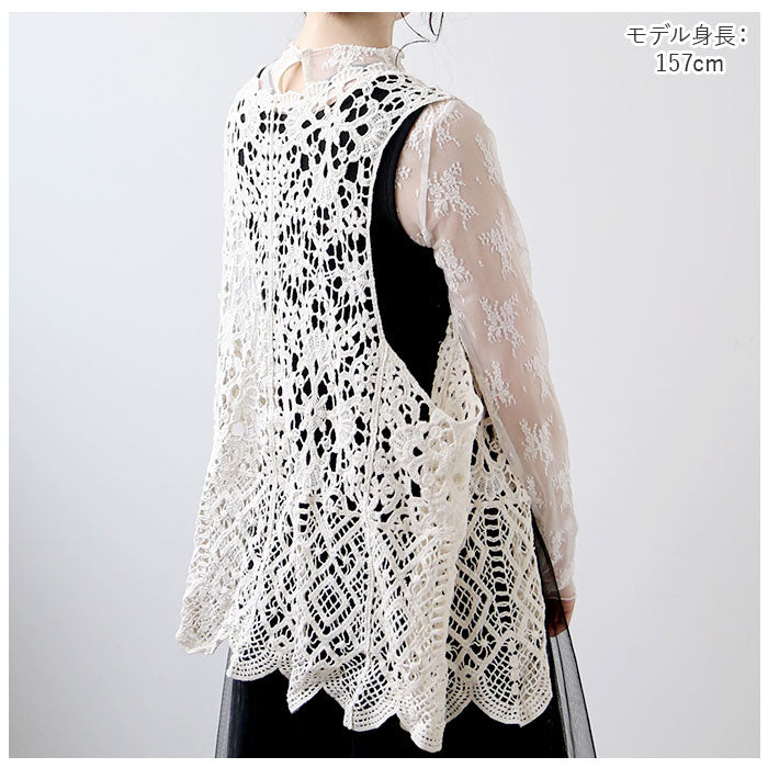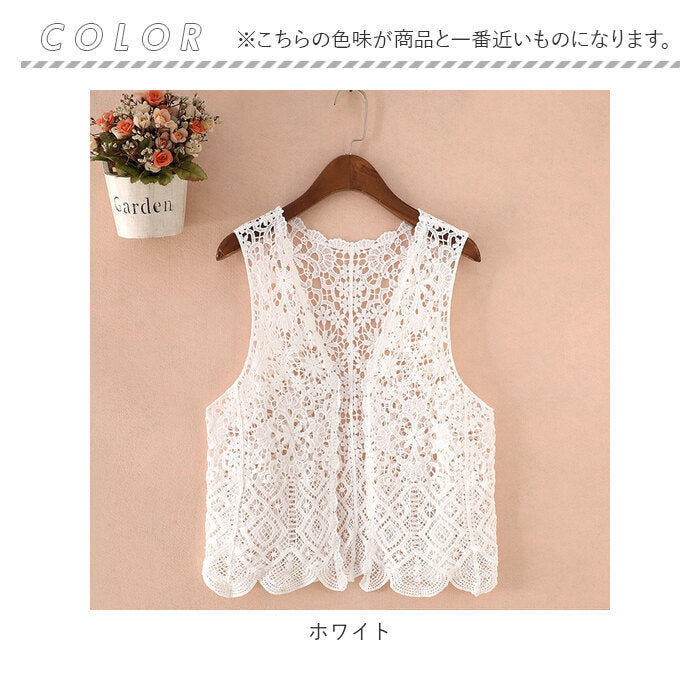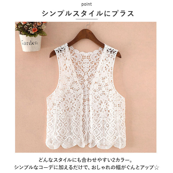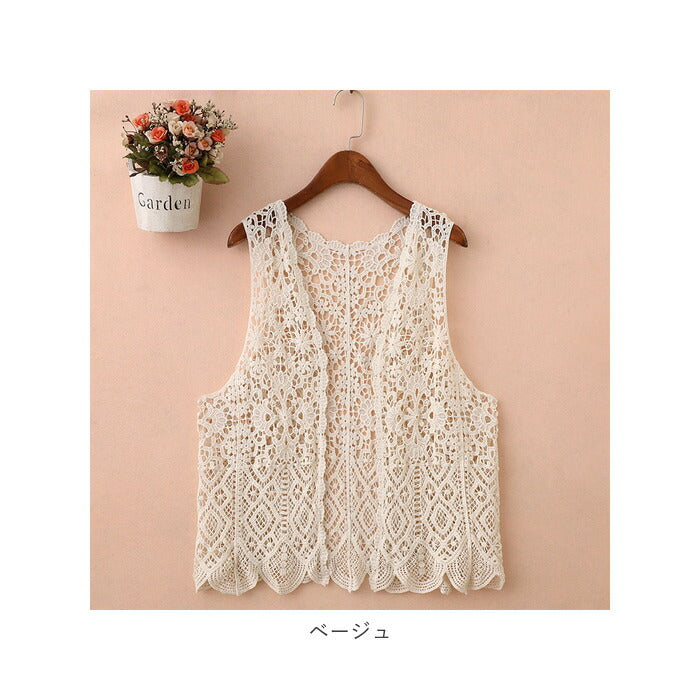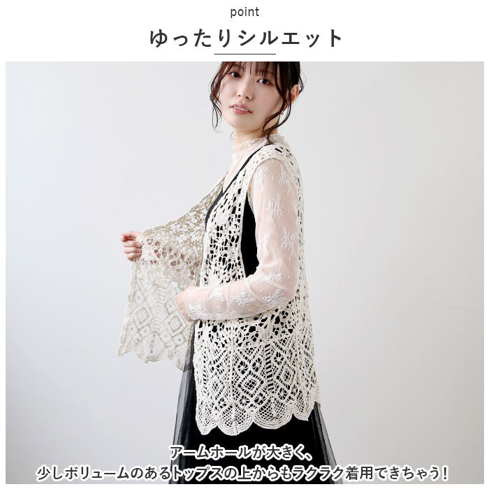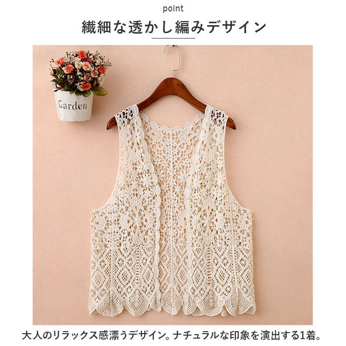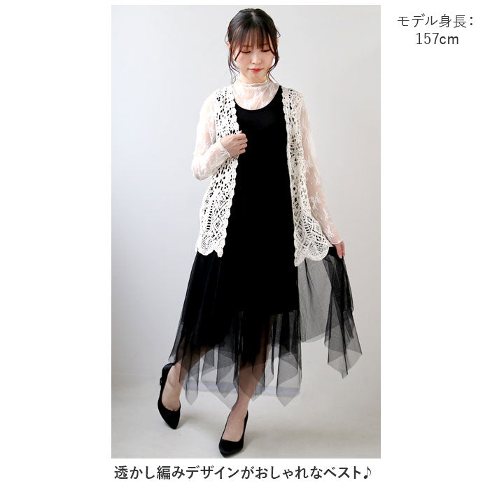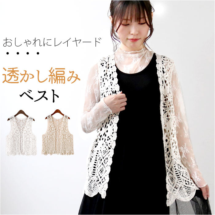 ベスト ジレ 前開き 通販 レディース 羽織り 重ね着 レイヤード ノースリーブ 総柄 ショート丈 ニット カジュアル 春 夏 透かし編み 春ベスト おしゃれ かわいい