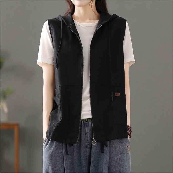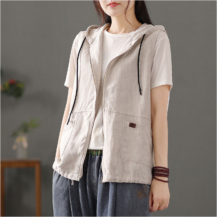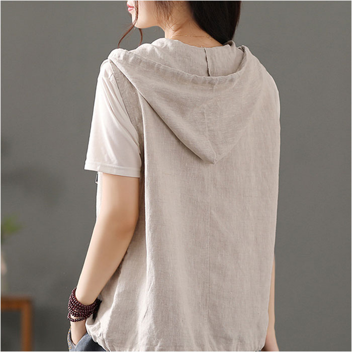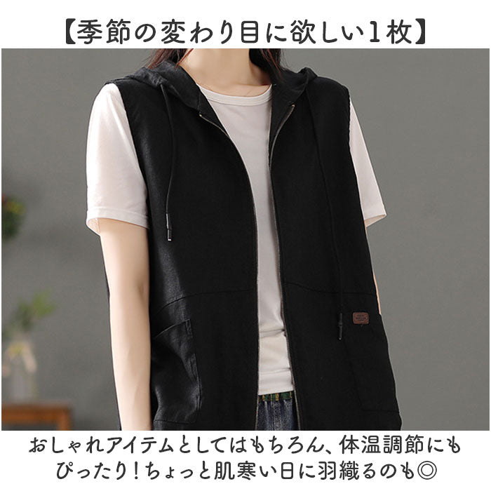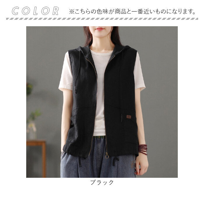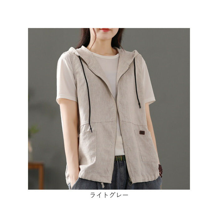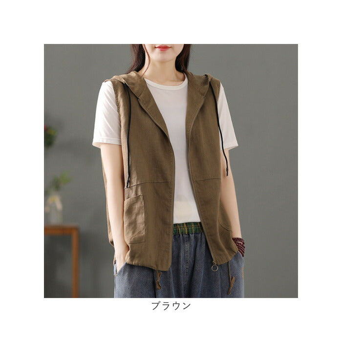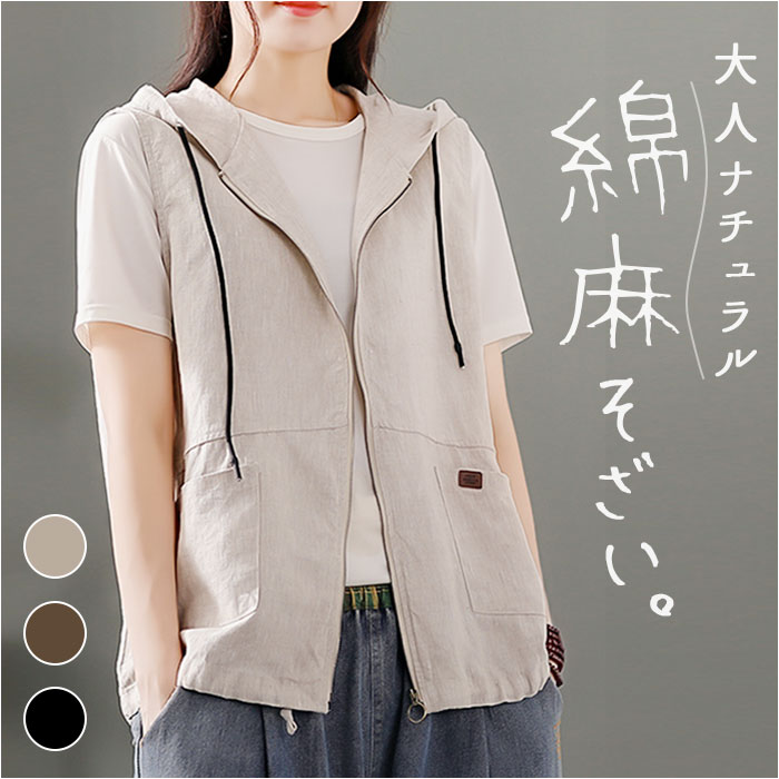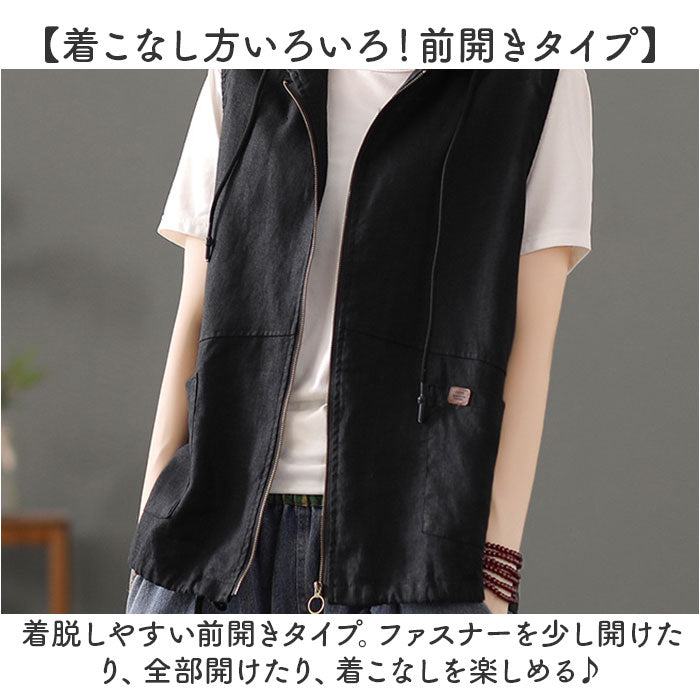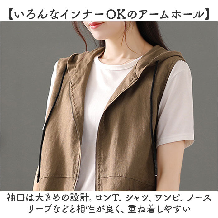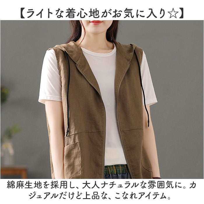 フード 前開きベスト レディース 綿麻風