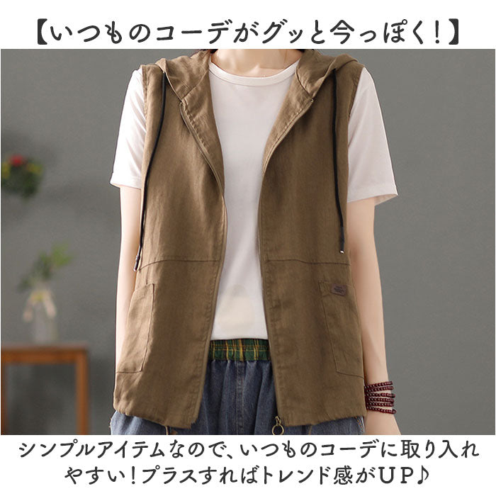 ベスト レディース 前開き 通販 前あきベスト フード付きベスト 綿麻混 ポケット付き 羽織もの はおりもの 重ね着 レイヤード 春 夏 秋 シンプル 無地 おしゃれ 大人 かわいい オシャレ