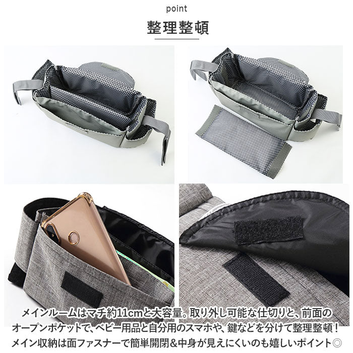 ・外出先で、おむつ・哺乳瓶・おもちゃ・お菓子・スマホ・鍵etc...バッグから取り出したいものはいっぱい。ベビーカーの持ち手に取り付けることで、欲しいものを手元からサッと出せる!