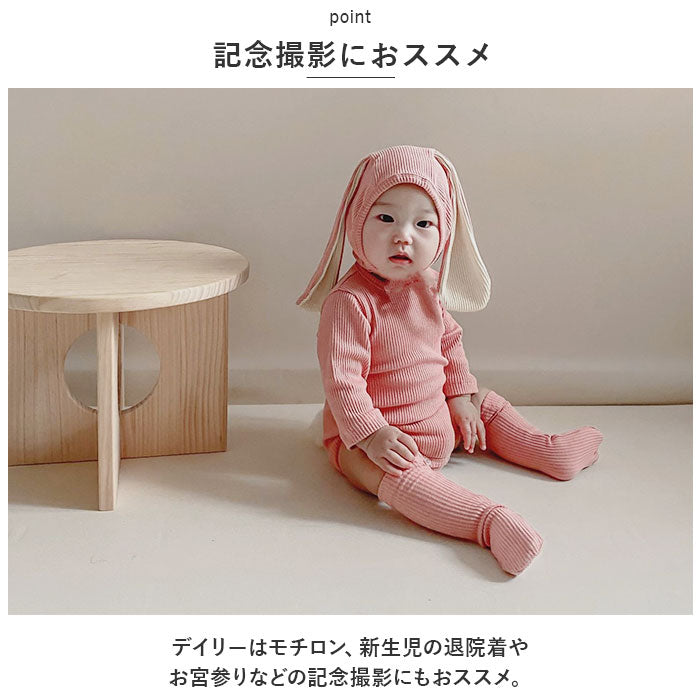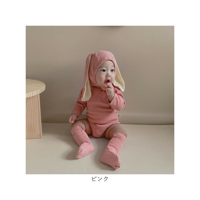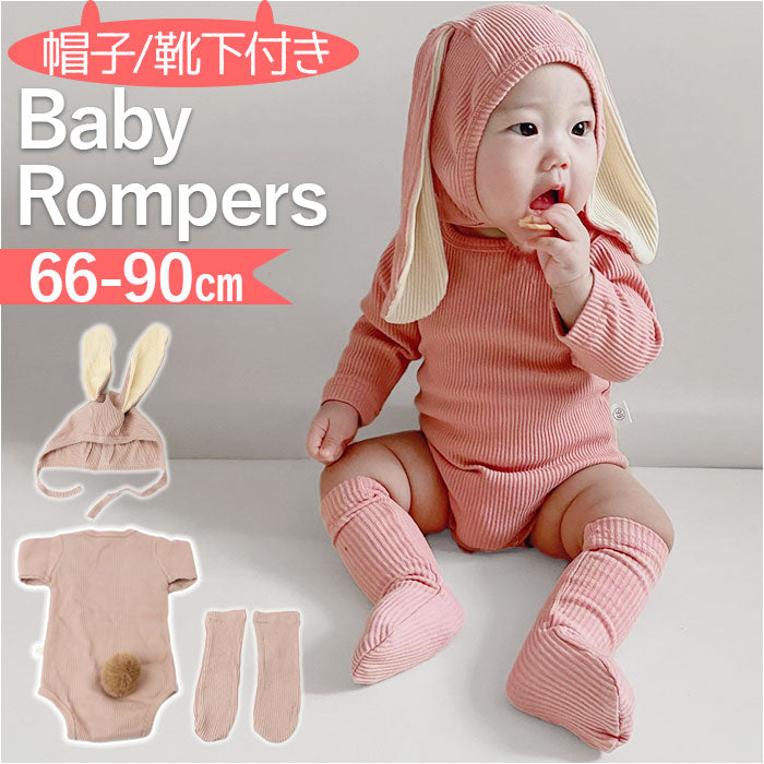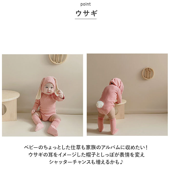ベビー服 ロンパース 通販 オールインワン カバーオール ボディスーツ 長袖 ベビー服 子供服 綿 コットン 帽子付き うさ耳 靴下付き 3点セット お出かけ 外出 部屋着 パジャマ 春 秋 冬