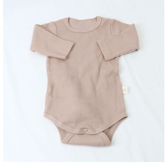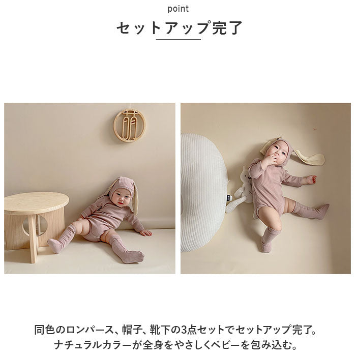 ・ナチュラルカラーがやさしくベビーを包み込む。同色のロンパース、帽子、靴下の3点セット。
