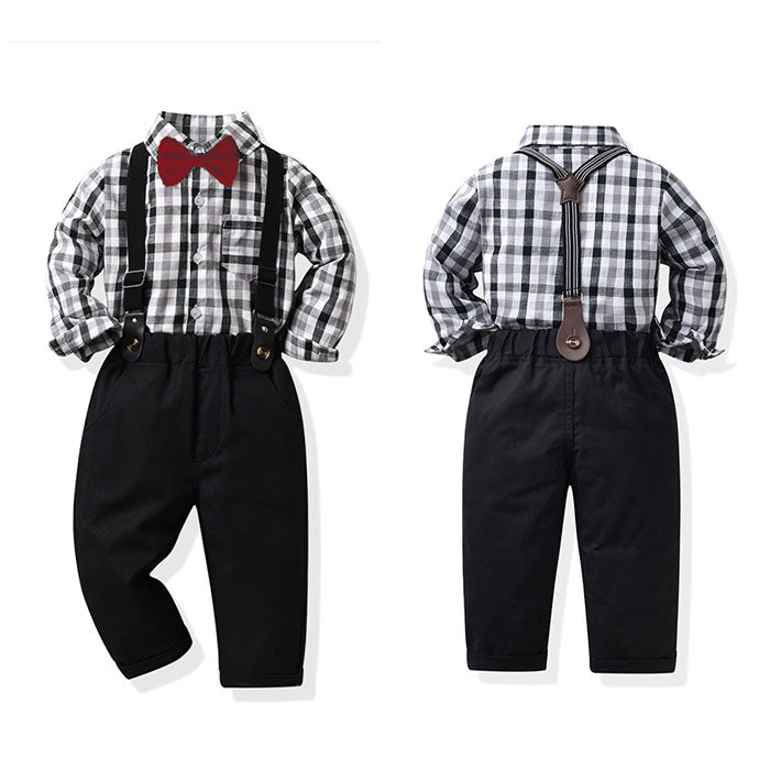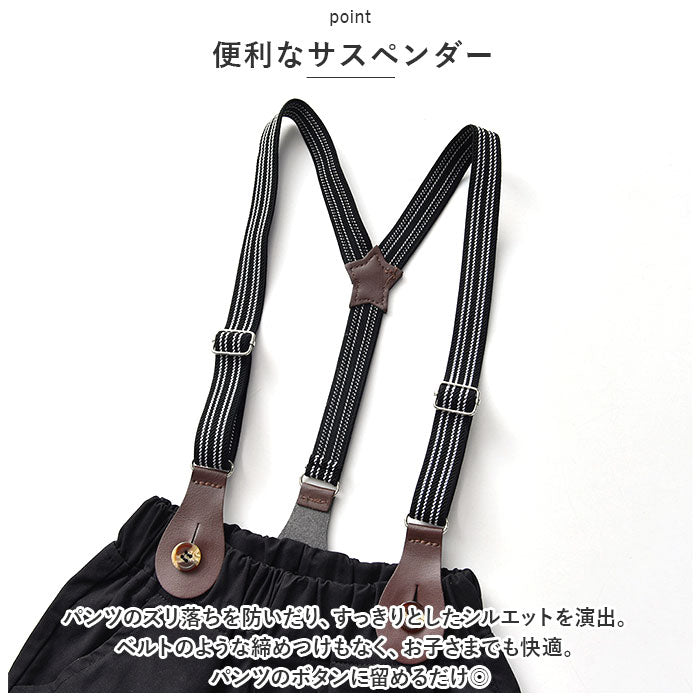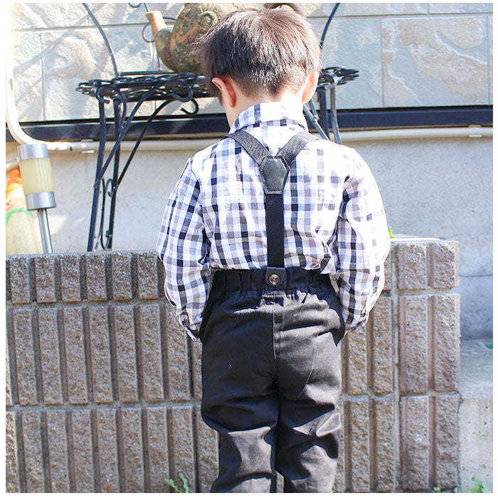 ・長袖シャツ、ロングパンツ、蝶ネクタイ、サスペンダーの4点セット。大人顔負けのスタイリングが完成☆