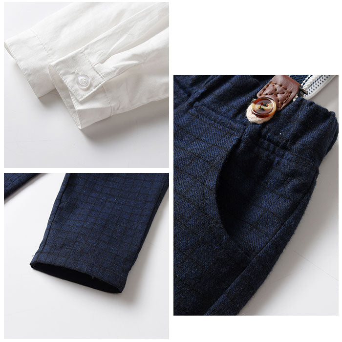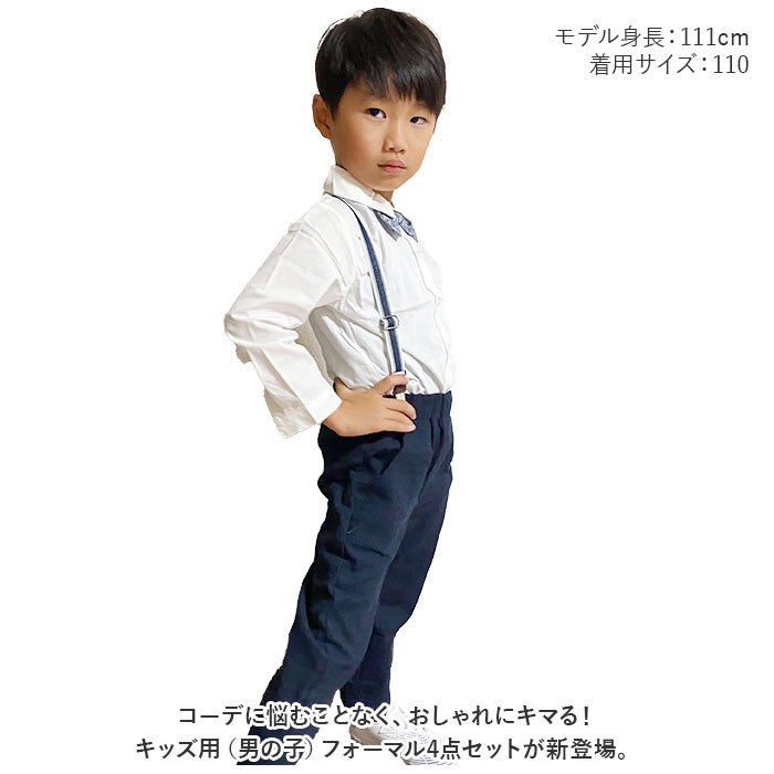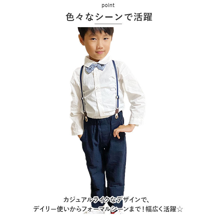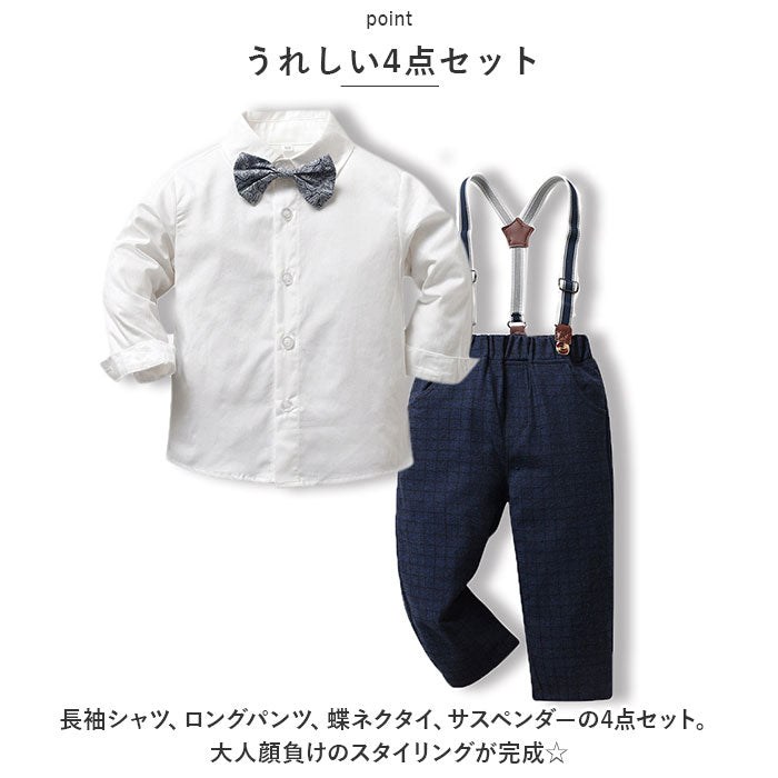 ・長袖シャツ、ロングパンツ、蝶ネクタイ、サスペンダーの4点セット。大人顔負けのスタイリングが完成☆