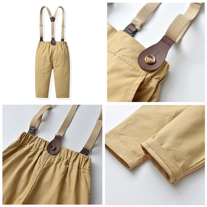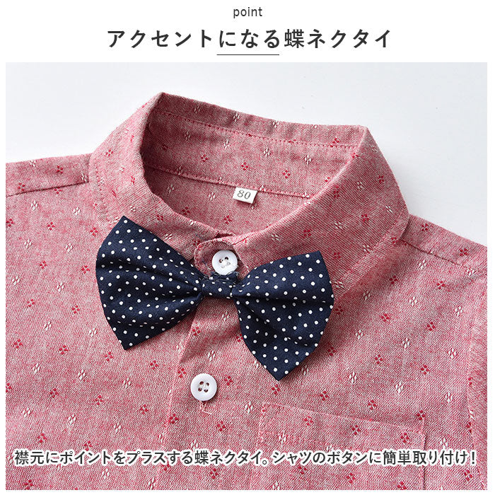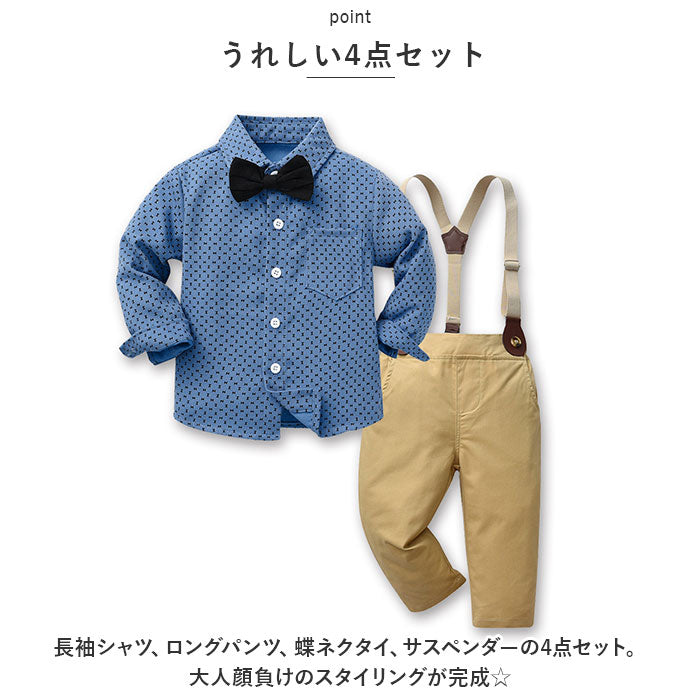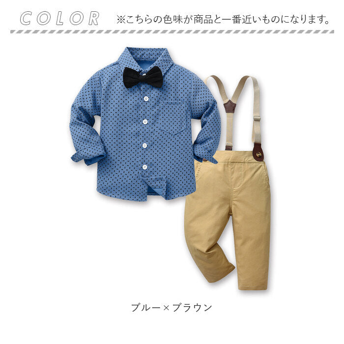 ・長袖シャツ、ロングパンツ、蝶ネクタイ、サスペンダーの4点セット。大人顔負けのスタイリングが完成☆