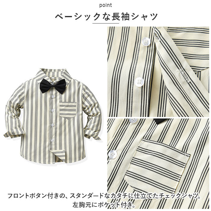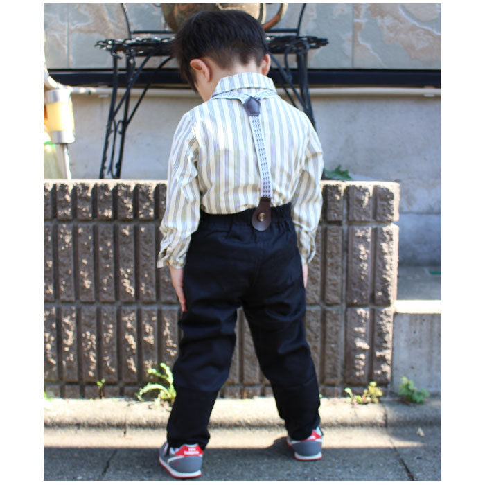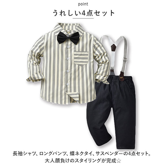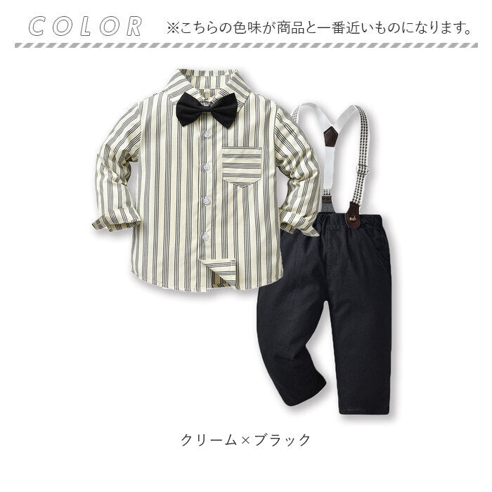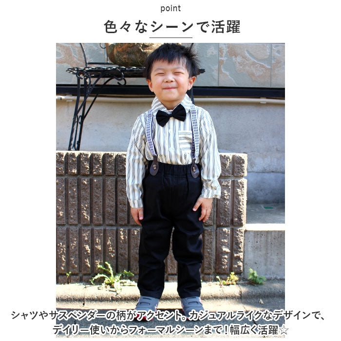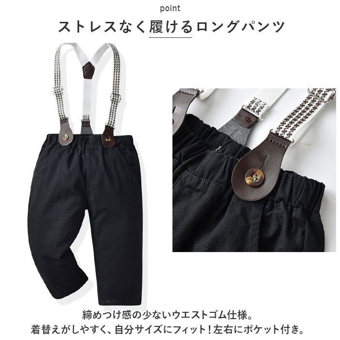 ・長袖シャツ、ロングパンツ、蝶ネクタイ、サスペンダーの4点セット。大人顔負けのスタイリングが完成☆