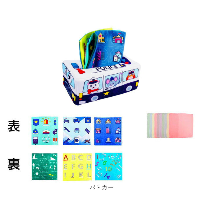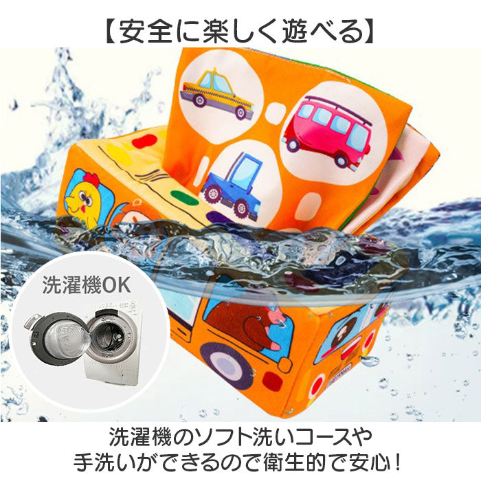 ・遊びながら知識やスキルを身につけるティッシュケース風知育おもちゃ。