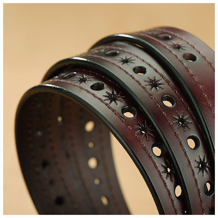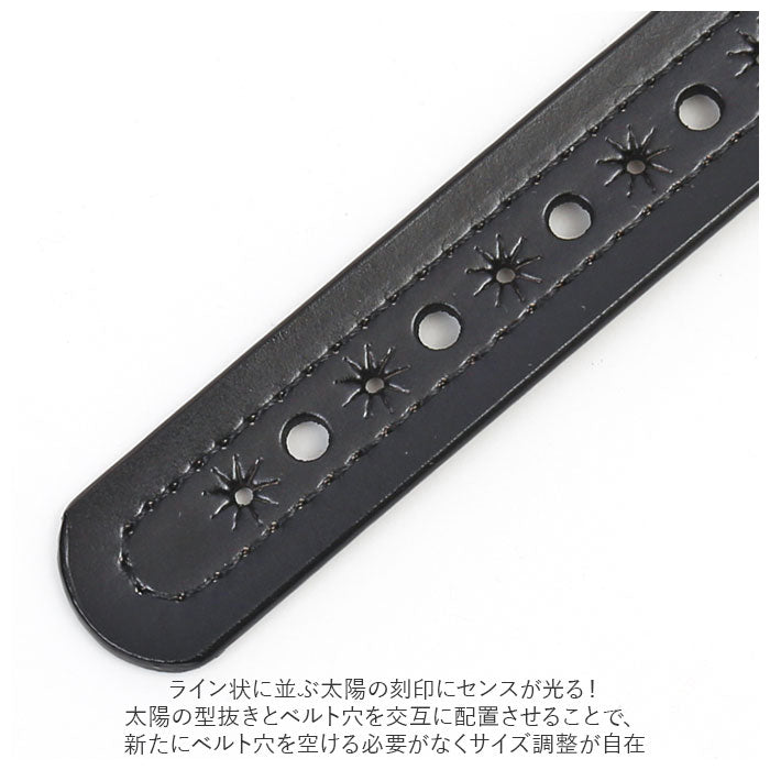 ・太陽をモチーフにしたネイティブアメリカン風の型抜きと、ベルト穴を交互に配置させることで、新たにベルト穴を空ける必要がなくサイズ調整が自在。(※バックル裏のネジを外し、ご家庭のハサミでベルト生地をちょうどよい長さにカットすることも可能です。)