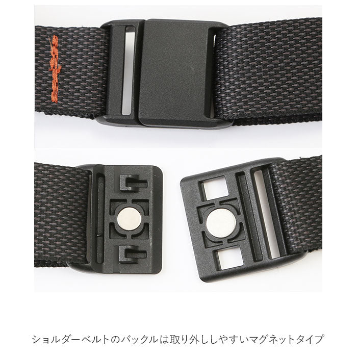 ・ショルダーベルトのバックルは取り外ししやすいマグネットタイプ。