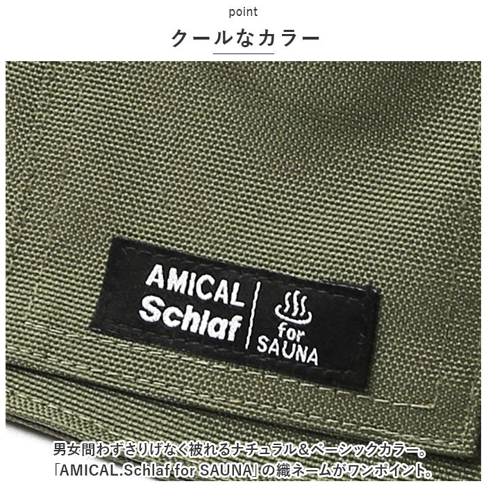 ・男女問わずさりげなく被れるナチュラル&ベーシックカラー。「AMICAL.Schlaf for SAUNA」の織ネームがワンポイント。