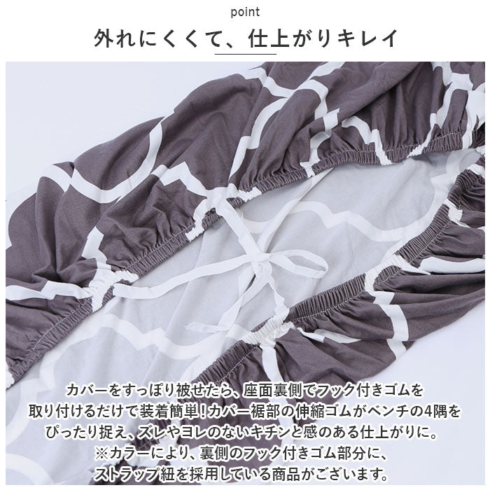 ・カバーをすっぽり被せたら、座面裏側でフック付きゴムを取り付けるだけで装着簡単!カバー裾部の伸縮ゴムがベンチの4隅をぴったり捉え、ズレやヨレのないキチンと感のある仕上がりに。(※カラーにより、裏側のフック付きゴム部分に、ストラップ紐を採用している商品がございます。)