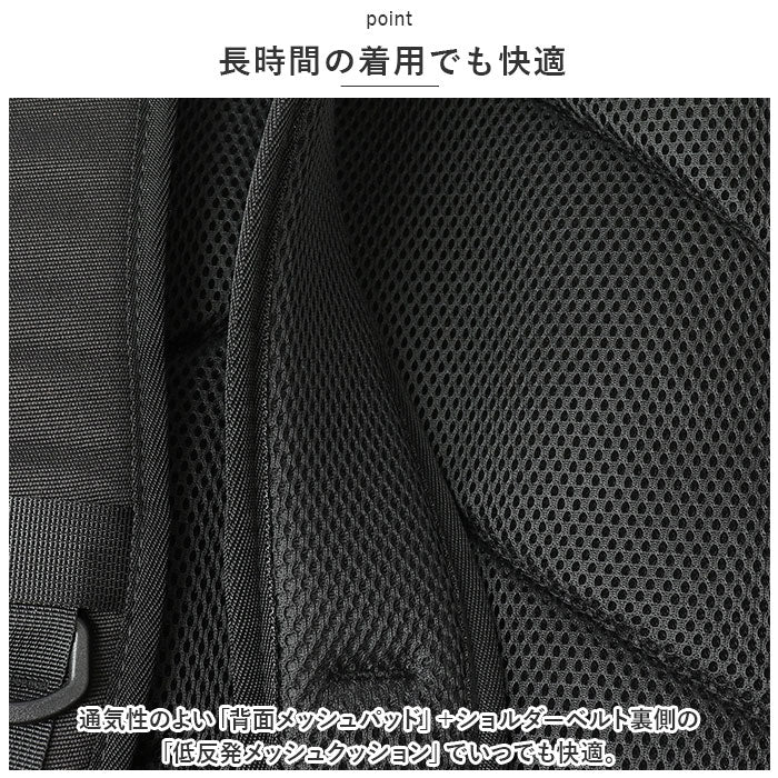 ・通気性のよい「背面メッシュパッド」+ショルダーベルト裏側の「低反発メッシュクッション」でいつでも快適。