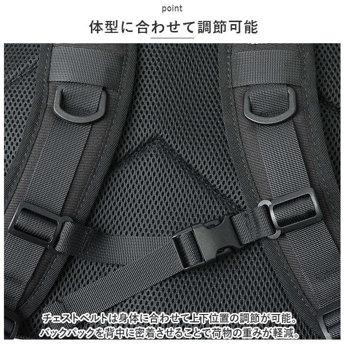 ※チェストベルトは身体に合わせて上下位置の調節が可能。バックパックを背中に密着させることで荷物の重みが軽減。