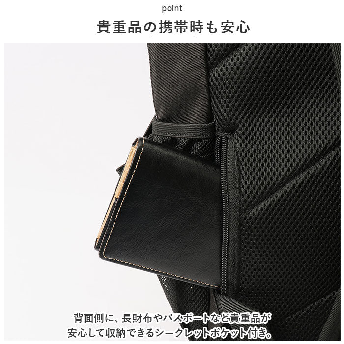 ・背面側に、長財布やパスポートなど貴重品が安心して収納できるシークレットポケット付き。