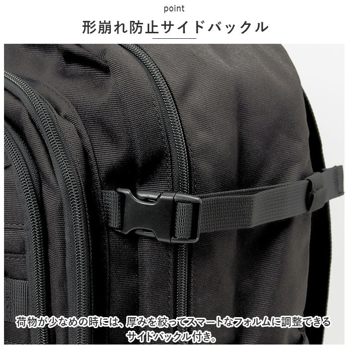 ・荷物が少なめの時には、厚みを絞ってスマートなフォルムに調整できるサイドバックル付き。