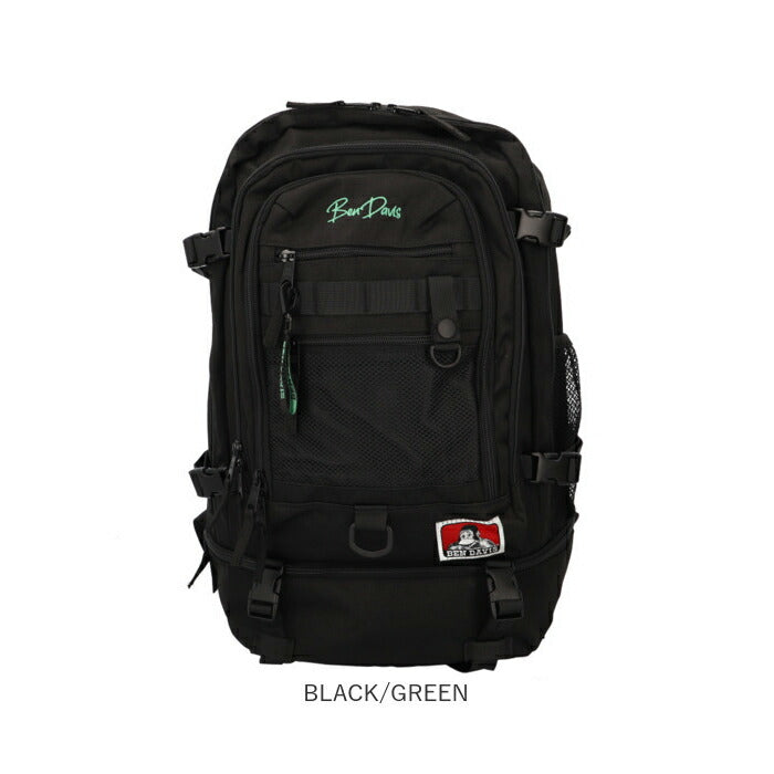 ・「BEN DAVIS」のロゴ刺繍が目を惹くバックパック前面に、「魅せる収納」を叶えるメッシュポケット×1、普段使いのアイテムがサッと取り出せるファスナーポケット×1も装備。
