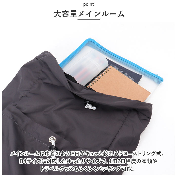 ・メインルームは巾着のように口がキュッと絞れるドローストリング式。B4サイズに対応したゆったりサイズで、1泊2日程度の衣類やトラベルグッズもらくらくパッキング可能。