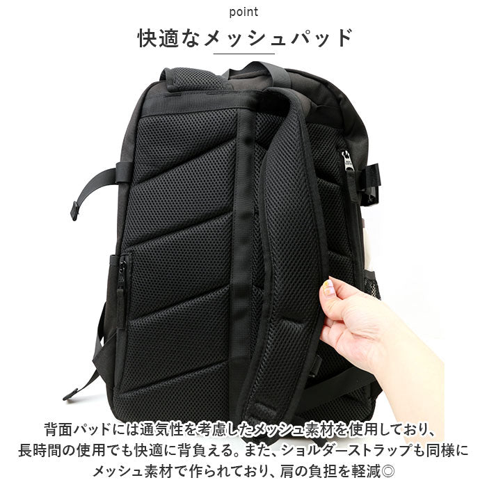 ・背面パッドとショルダーストラップには通気性を考慮したメッシュ素材を使用。長時間の使用でも快適に背負える。
