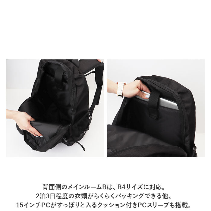 ・背面側のメインルームBは、B4サイズに対応。2泊3日程度の衣類がらくらくパッキングできる他、15インチPCがすっぽりと入るクッション付きPCスリーブも搭載。
