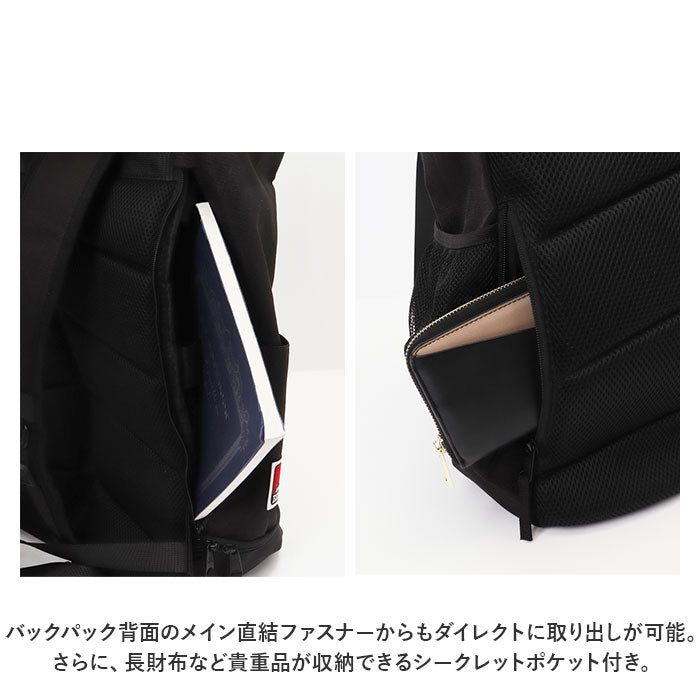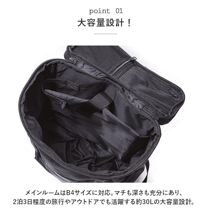 ・メインルームはB4サイズに対応。マチも深さも充分にあり、旅行やアウトドアでも活躍する約30Lの大容量設計。