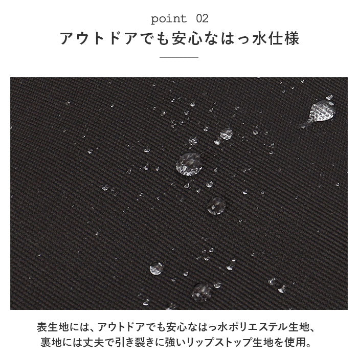 ・表生地にははっ水ポリエステル生地、裏地には丈夫で引き裂きに強いリップストップ生地を使用。