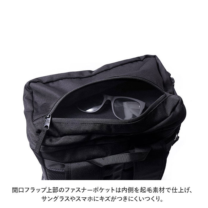 ・開口フラップ上部のファスナーポケットは内側を起毛素材で仕上げ、サングラスやスマホにキズがつきにくいつくり。