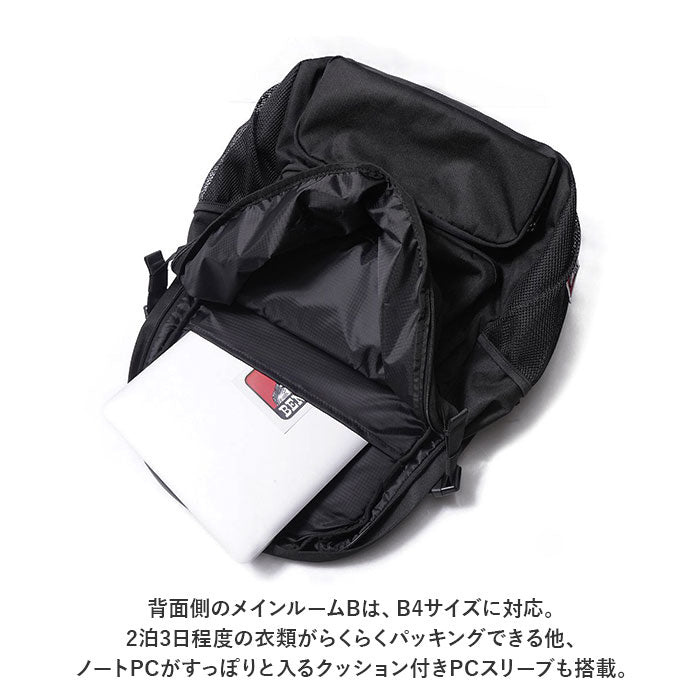 ・背面側のメインルームBは、B4サイズに対応。2泊3日程度の衣類がらくらくパッキングできる他、ノートPCがすっぽりと入るクッション付きPCスリーブも搭載。