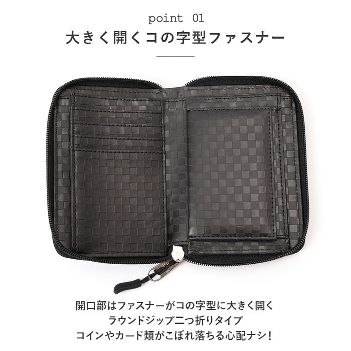 ・開口部はファスナーがコの字型に大きく開くラウンドジップ二つ折りタイプ。コインやカード類がこぼれ落ちる心配ナシ!
