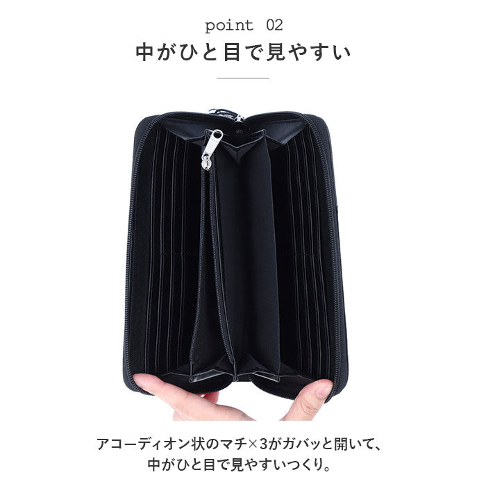 ・開口部はファスナーがコの字型に大きく開くラウンドファスナー仕様。