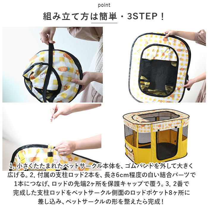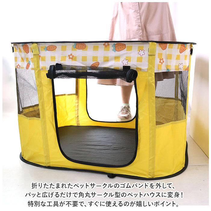 ・折りたたまれたペットサークルのゴムバンドを外して、パッと広げるだけで角丸サークル型のペットハウスに変身!特別な工具が不要で、すぐに使えるのが嬉しいポイント。