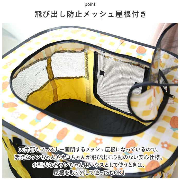 ・天井部もファスナー開閉するメッシュ屋根になっているので、活発なワンちゃんやネコちゃんが飛び出す心配のない安心仕様。小型犬などワンちゃん用ハウスとして使うときは、屋根を取り外して使ってもOK!