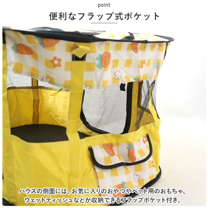 ・ハウスの側面には、お気に入りのおやつやペット用のおもちゃ、ウェットティッシュなどが収納できるフラップポケット付き。