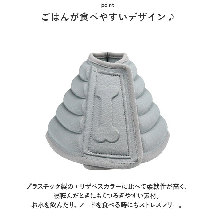 ・プラスチック製のエリザベスカラーに比べて柔軟性が高く、寝転んだときにもくつろぎやすい素材。お水を飲んだり、フードを食べる時にもストレスフリー。