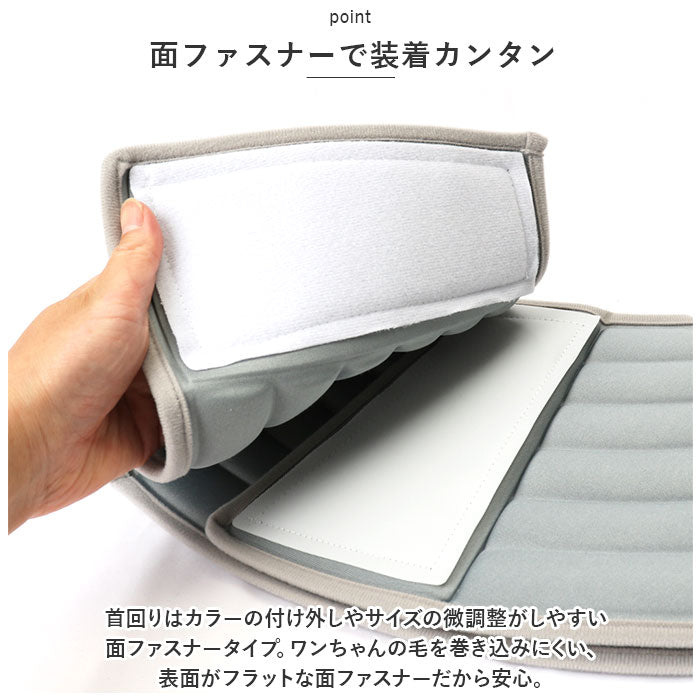 ・首回りはカラーの付け外しやサイズの微調整がしやすい面ファスナータイプ。ワンちゃんの毛を巻き込みにくい、表面がフラットな面ファスナーだから安心。