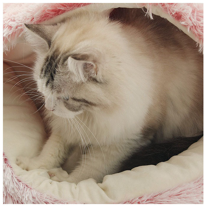 ・すっぽり入るデザインで、優しく柔らかくペットを包み込んでくれるクッション。もたれたり丸まって眠ったりラクな姿勢でくつろげて、保温性もばっちり◎