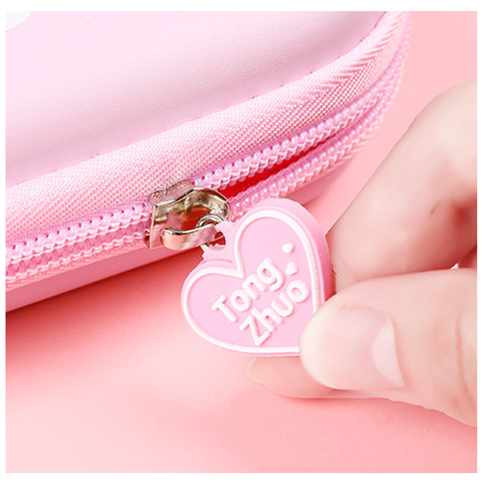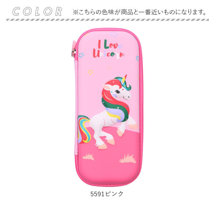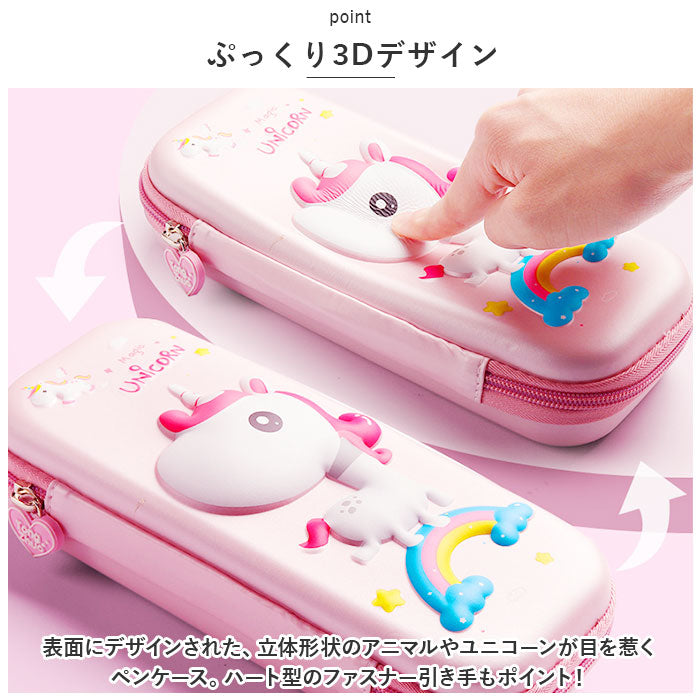 ・表面にデザインされた、立体形状のアニマルやユニコーンが目を惹くペンケース。ハート型のファスナー引き手もポイント!