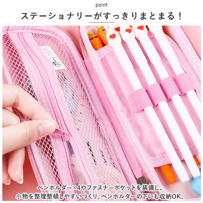 ・ペンホルダー×4やファスナーポケットを装備し、小物を整理整頓しやすいつくり。ペンホルダーの下にも収納OK。