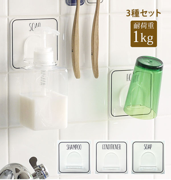 水に強くはがし跡が残りにくい、貼り付けるだけのスタイリッシュな「シャンプーボトルホルダー」「コンディショナーボトルホルダー」「ソープボトルホルダー」のセット。