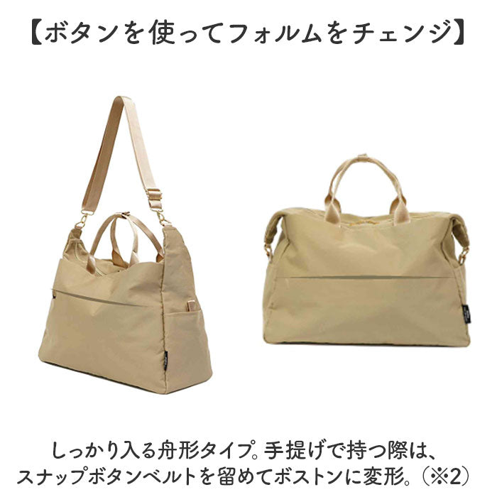 ・しっかり入る舟形タイプ。手提げで持つ際は、スナップボタンベルトを留めてボストンに変形。