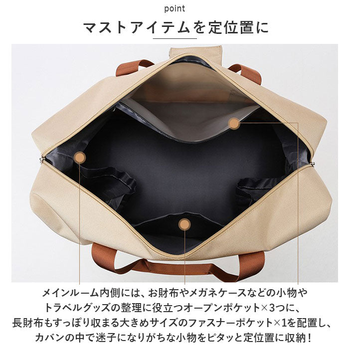 ・メインルーム内側には、お財布やメガネケースなどの小物やトラベルグッズの整理に役立つオープンポケット×3つに、長財布もすっぽり収まる大きめサイズのファスナーポケット×1を配置し、カバンの中で迷子になりがちな小物をピタッと定位置に収納!