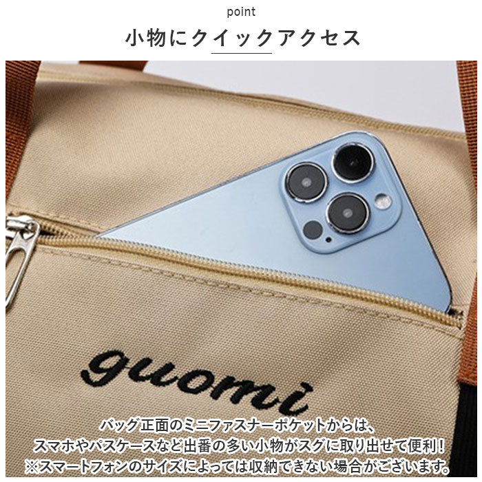・バッグ正面のミニファスナーポケットからは、スマホやパスケースなど出番の多い小物がスグに取り出せて便利!(※スマートフォンのサイズによっては収納できない場合がございます。)