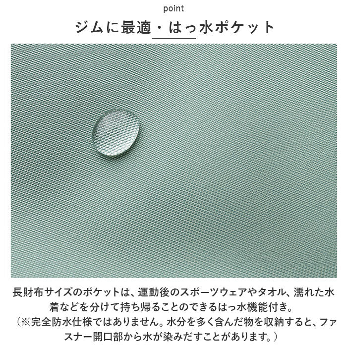 ・長財布サイズのポケットは、運動後のスポーツウェアやタオル、濡れた水着などを分けて持ち帰ることのできるはっ水機能付き。(※完全防水仕様ではありません。水分を多く含んだ物を収納すると、ファスナー開口部から水が染みだすことがあります。)