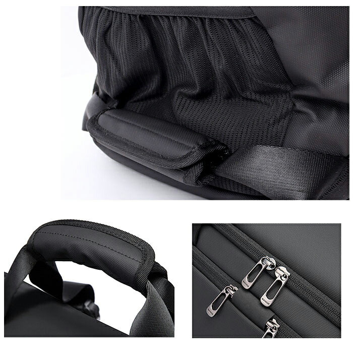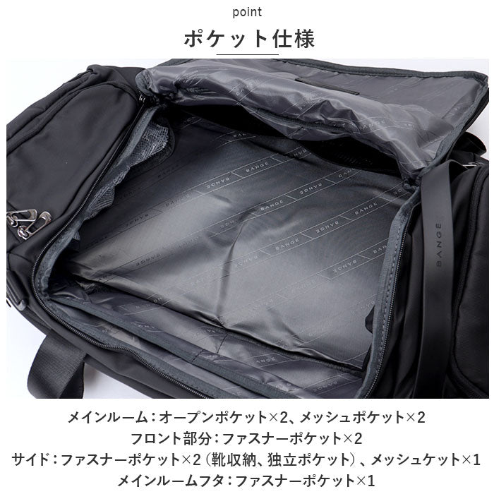 ・サイド:ファスナーポケット×2(靴収納、独立ポケット)、メッシュポケット×1