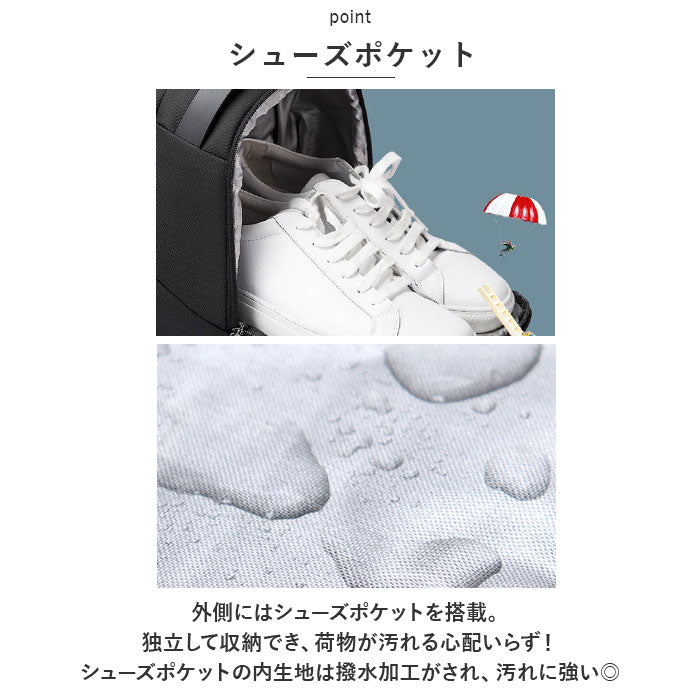 ・外側にはシューズポケットを搭載。独立して収納でき、荷物が汚れる心配いらず!シューズポケットの内生地は撥水加工がされ、汚れに強い◎