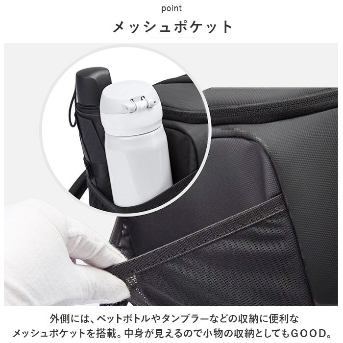 ・外側には、ペットボトルやタンブラーなどの収納に便利なメッシュポケットを搭載。中身が見えるので小物の収納としてもGOOD。