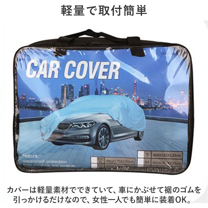 ・カバーは軽量素材でできていて、車にかぶせて裾のゴムを引っかけるだけなので、女性一人でも簡単に装着OK。