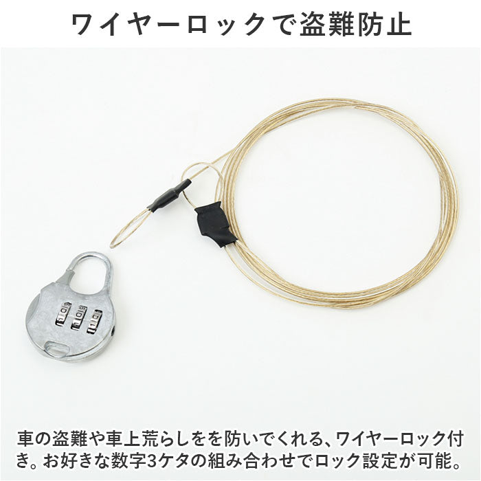 ・車の盗難や車上荒らしをを防いでくれる、ワイヤーロック付き。お好きな数字3ケタの組み合わせでロック設定が可能。