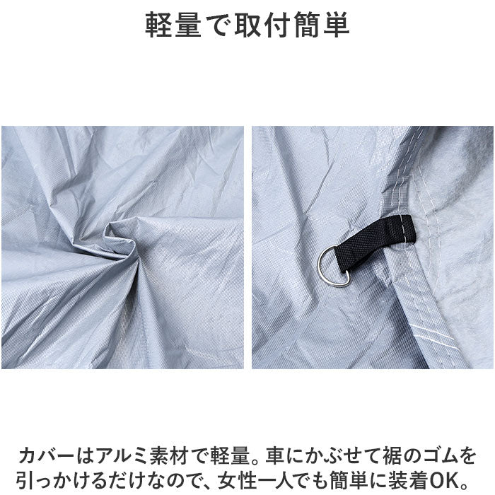 ・カバーはアルミ素材で軽量。車にかぶせて裾のゴムを引っかけるだけなので、女性一人でも簡単に装着OK。
