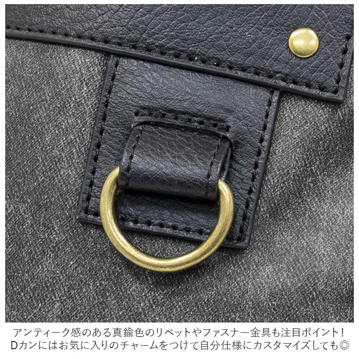 ・アンティーク感のある真鍮色のリベットやファスナー金具も注目ポイント!Dカンにはお気に入りのチャームをつけて自分仕様にカスタマイズしても◎